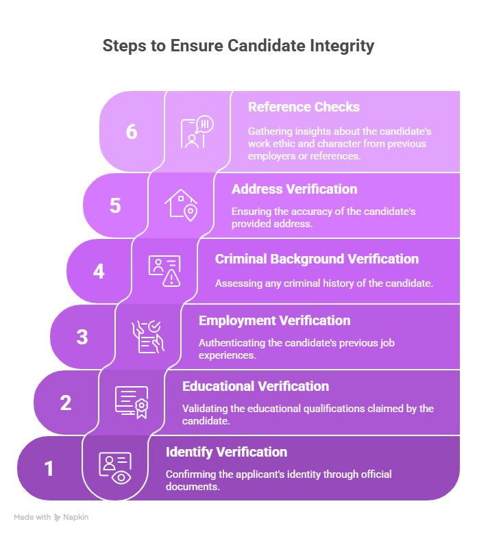 The main steps include resume screening, skill assessments, behavioral evaluations, background checks, employment verification, and reference checks. Together, these steps provide a complete understanding of the candidate’s abilities and credibility.