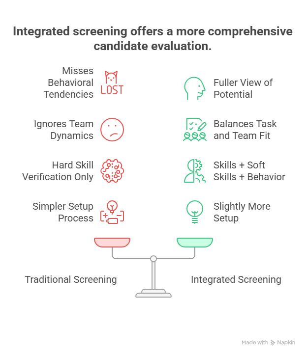 Soft skills like communication, emotional intelligence, and adaptability are harder to measure, but they’re just as essential to long-term success. That’s where integrated screening comes into the picture, bringing together technical evaluation and behavioral insight in one unified process.